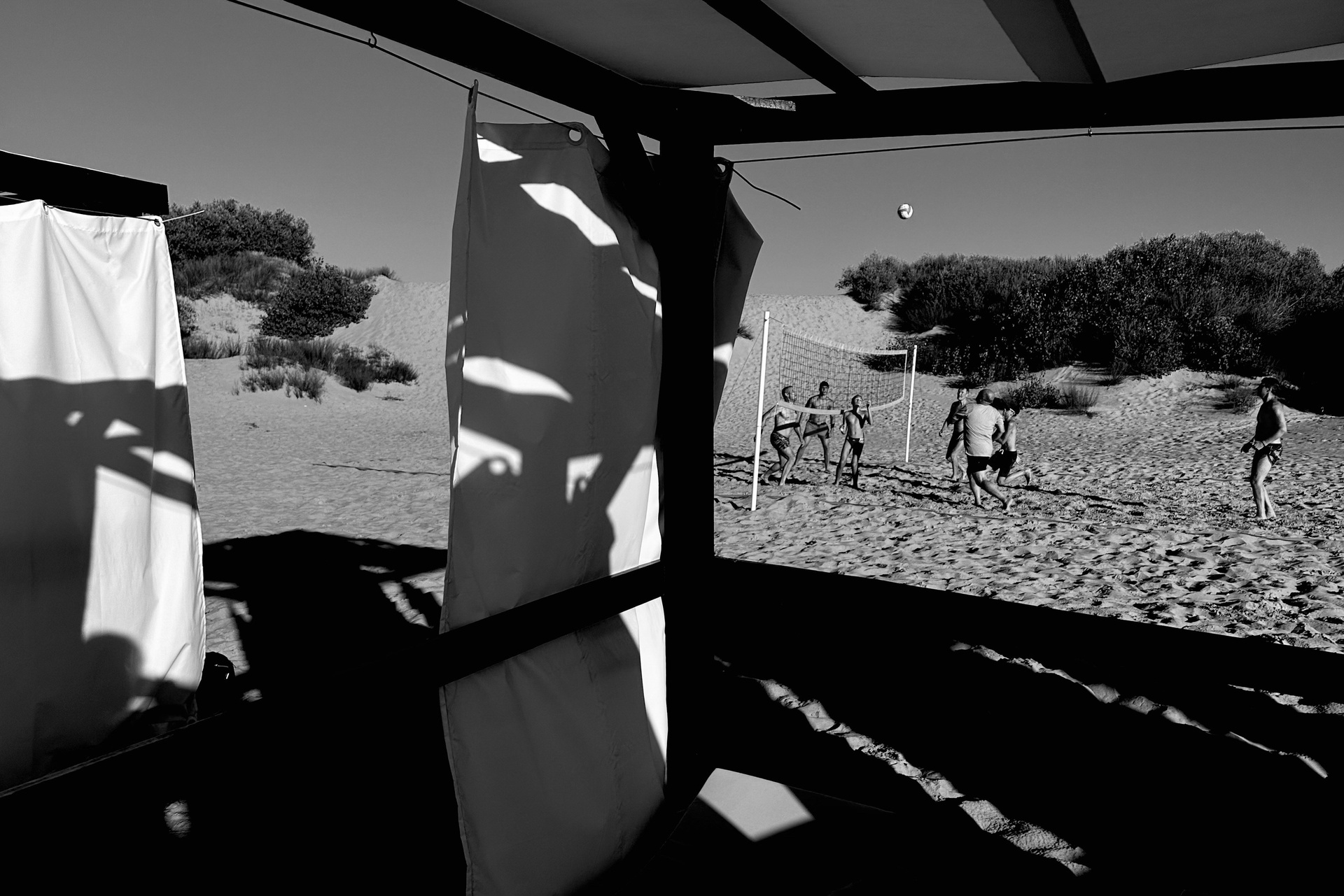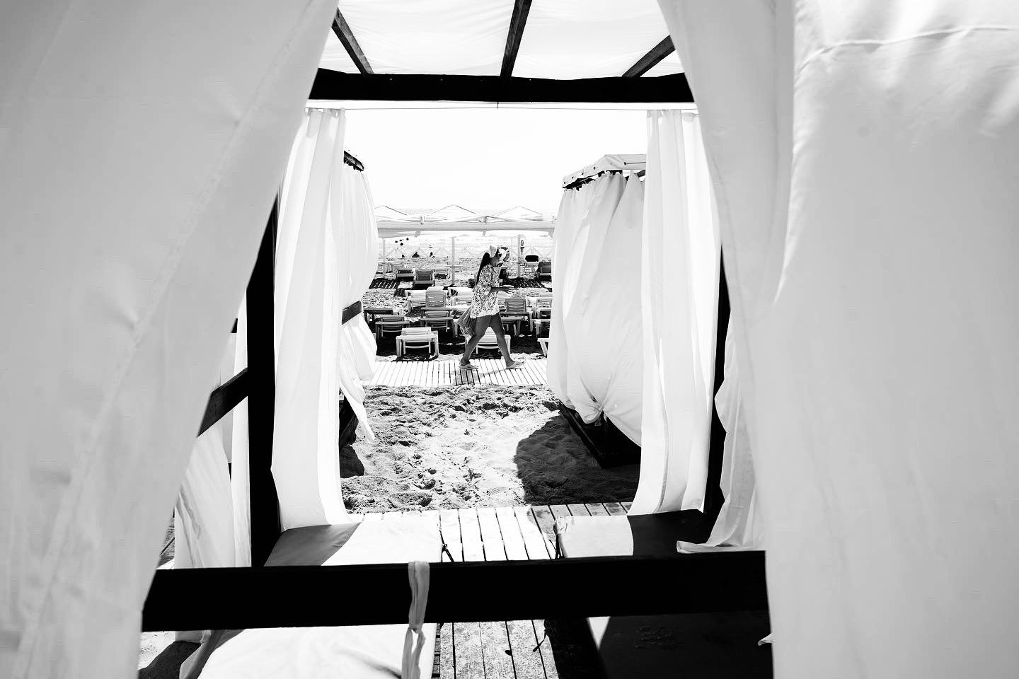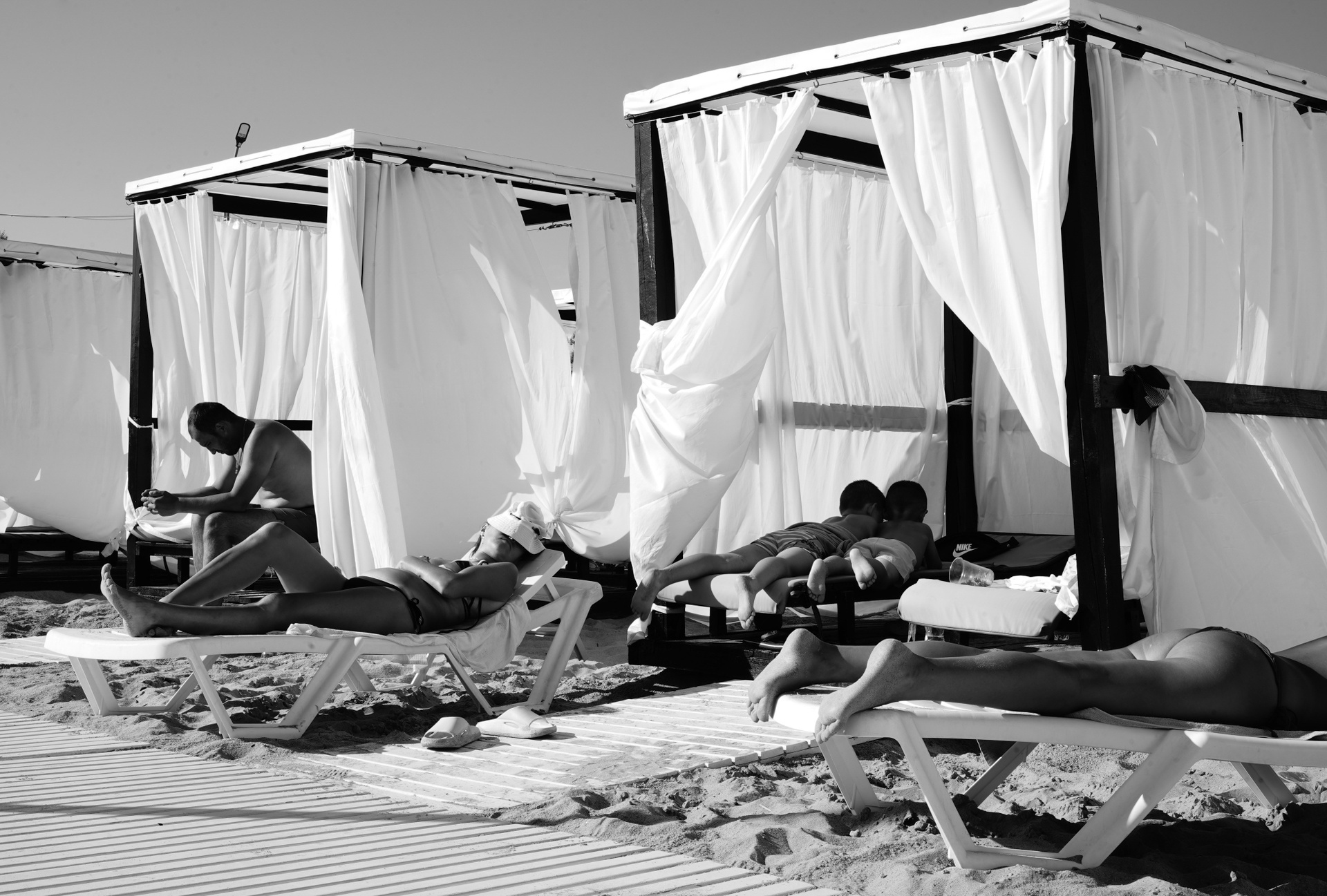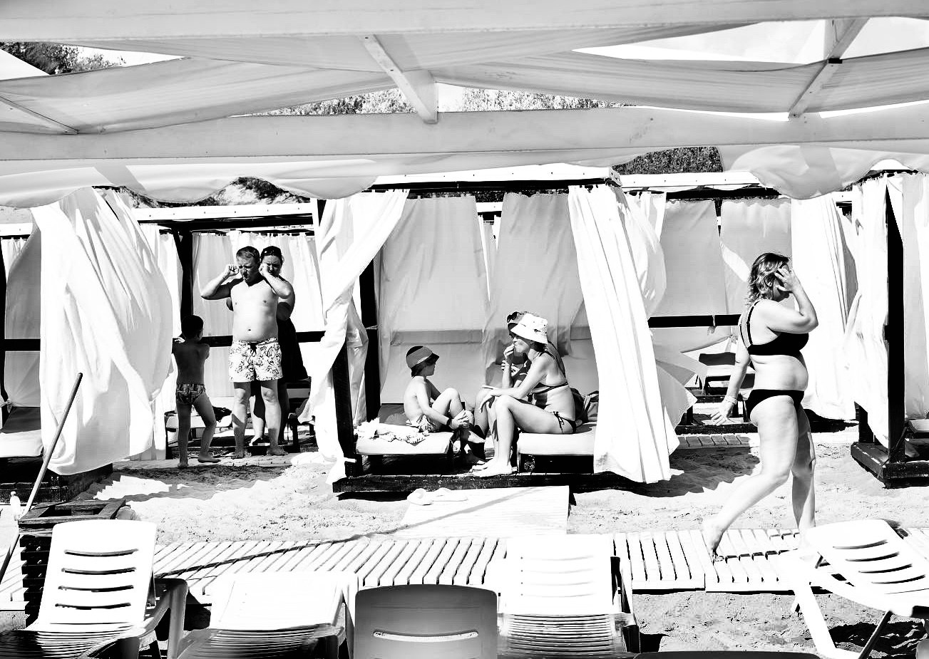 Эта черно-белая серия — про пляжную жизнь, где жара обостряет всё до предела: тени становятся глубже, солнце ярче, а фигуры людей будто расплавляются под палящим солнцем. Тут загорающие превращаются в театральных персонажей, а каждая занавеска — декорация для пляжного спектакля. Спектакль на пляже идёт без антракта, а зрители могут выбрать роль: быть в тени или стать частью игры.