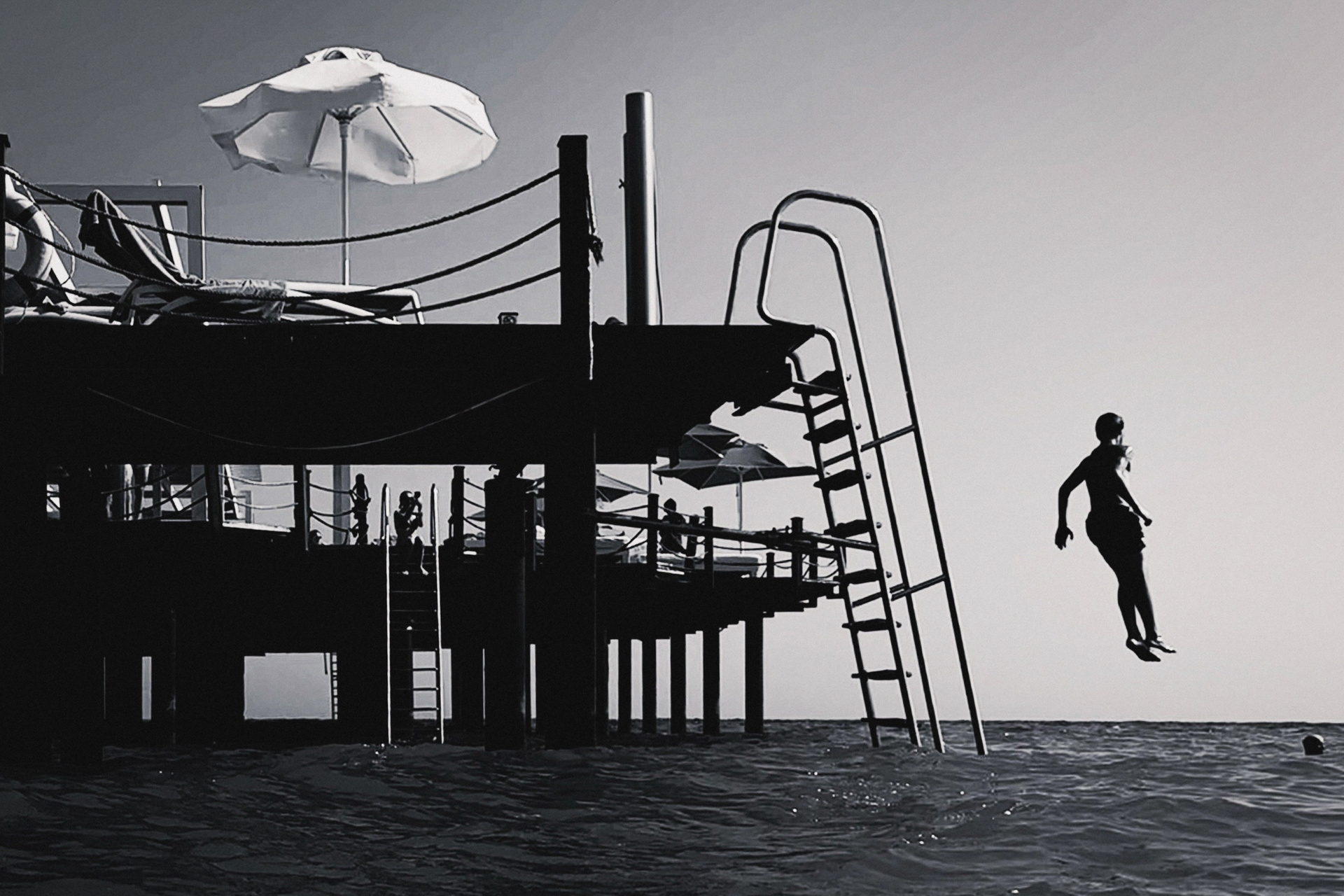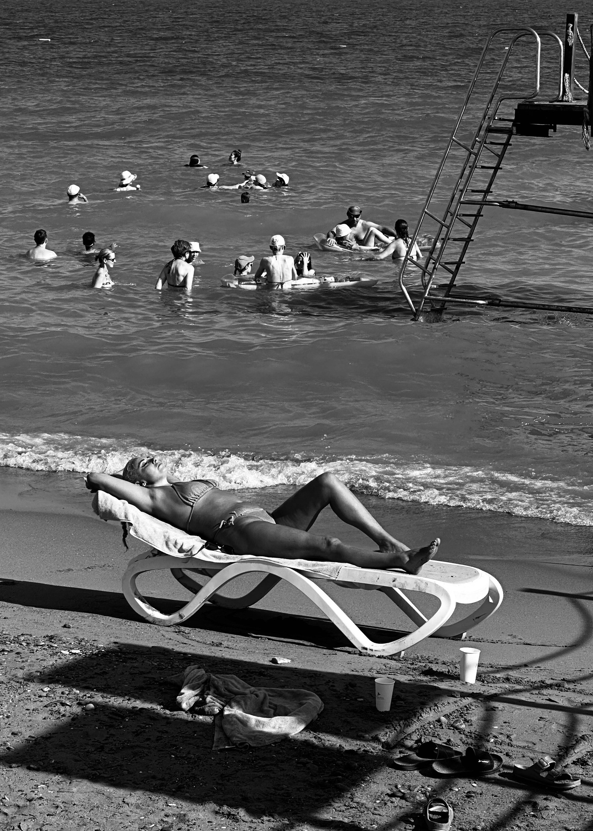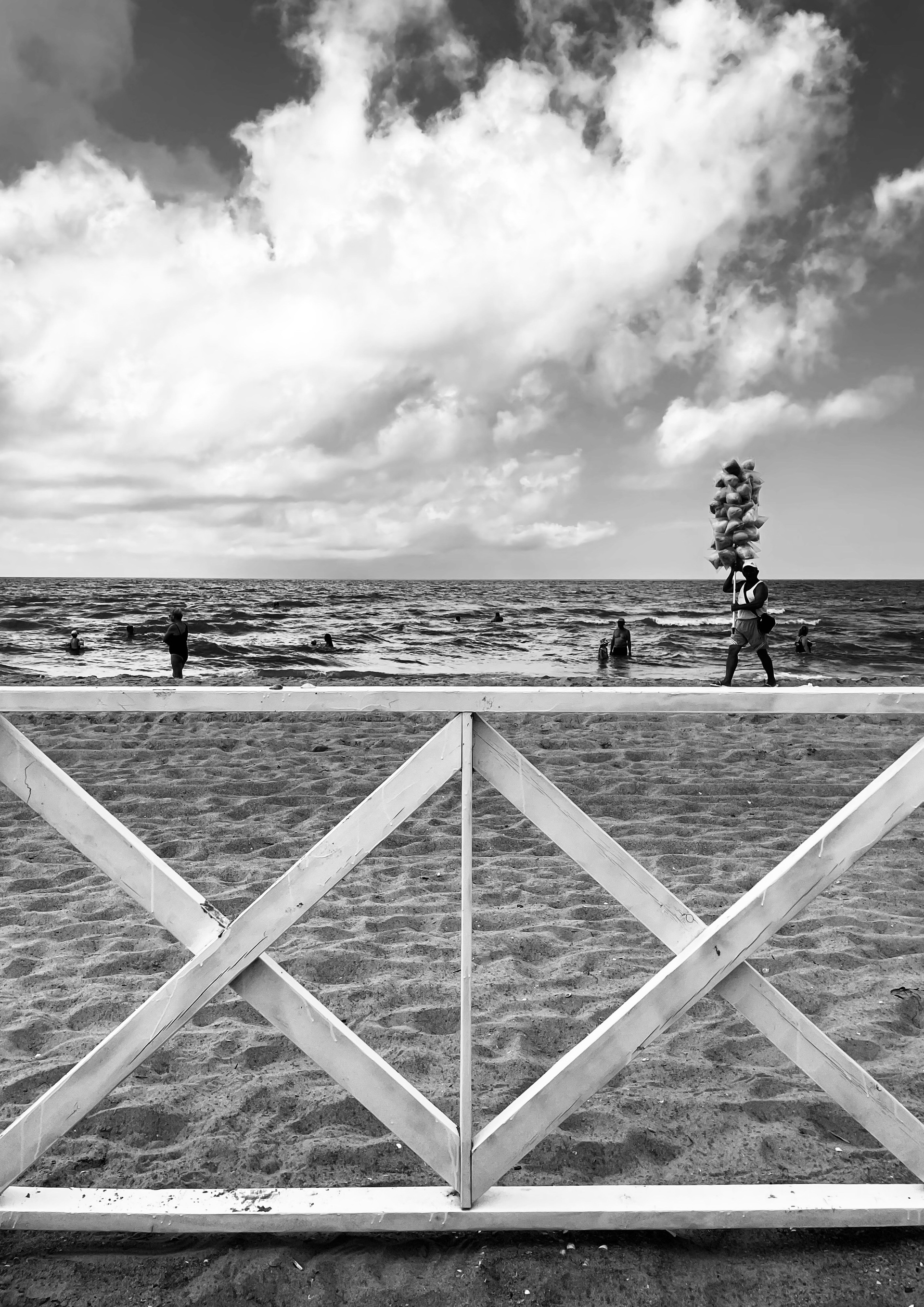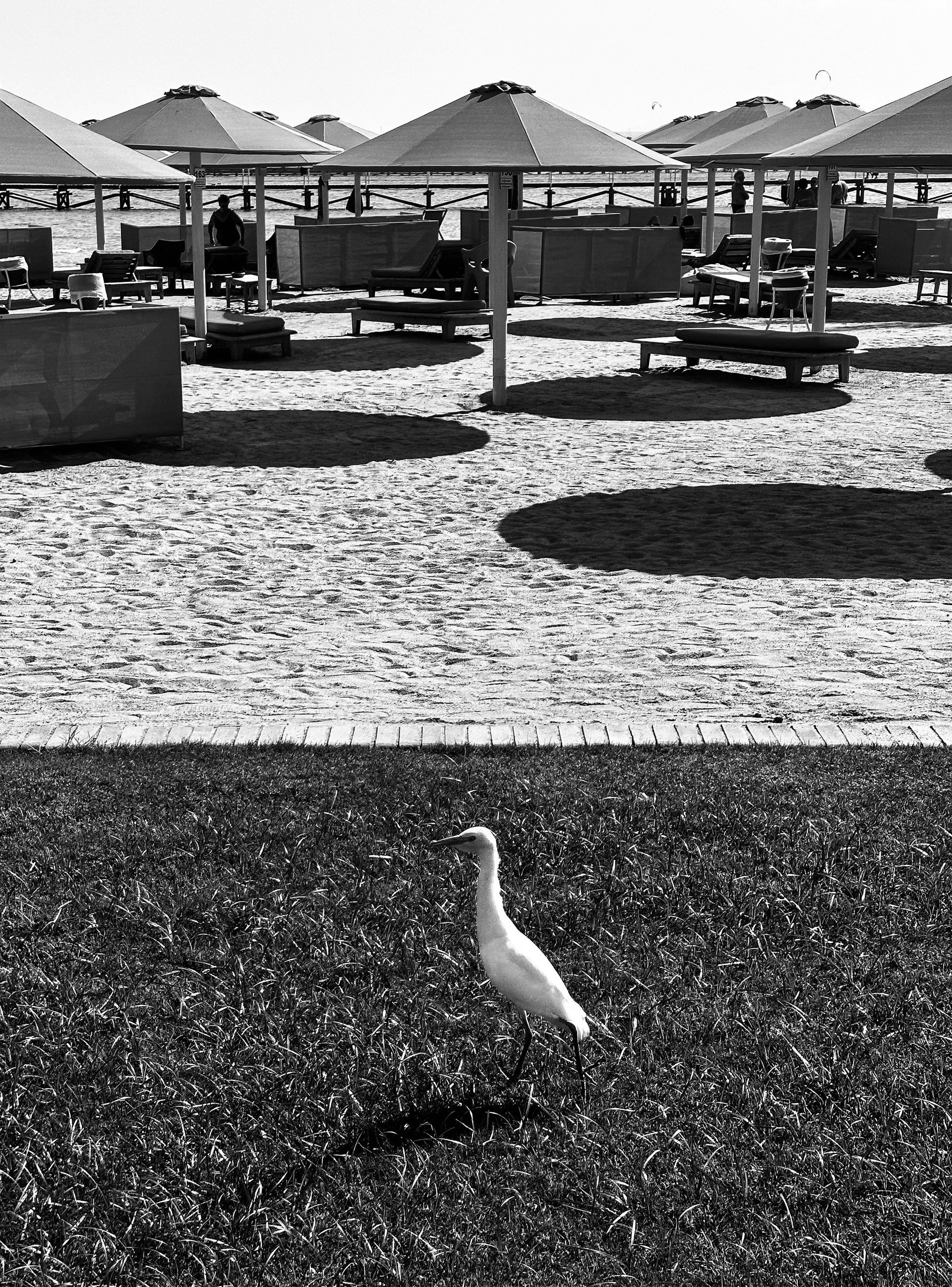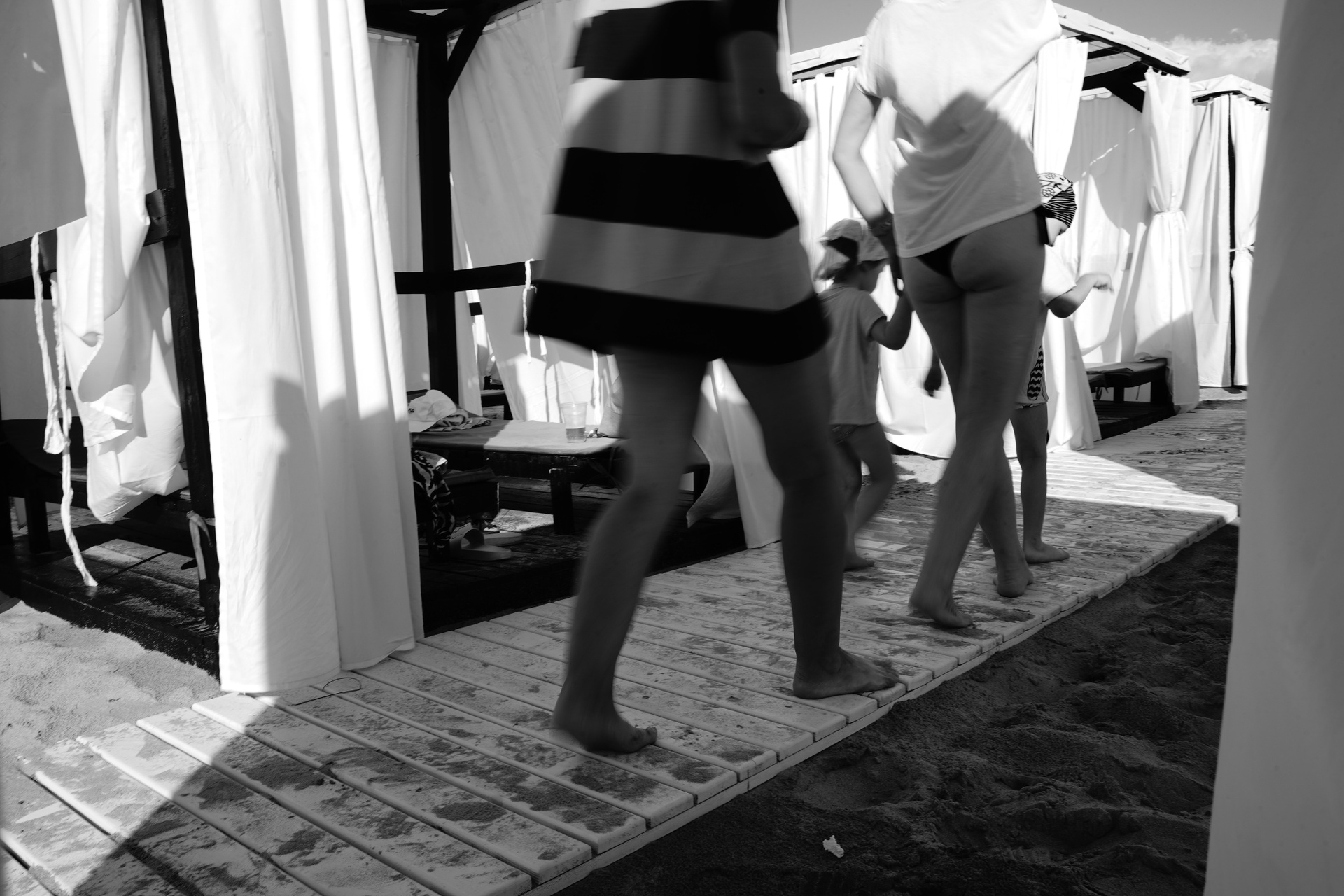 Эта черно-белая серия — про пляжную жизнь, где жара обостряет всё до предела: тени становятся глубже, солнце ярче, а фигуры людей будто расплавляются под палящим солнцем. Тут загорающие превращаются в театральных персонажей, а каждая занавеска — декорация для пляжного спектакля. Спектакль на пляже идёт без антракта, а зрители могут выбрать роль: быть в тени или стать частью игры.